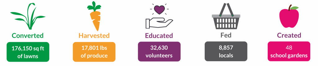 - Growing over 48 school gardens with 10 remaining as our “legacy schools” or long-term projects.